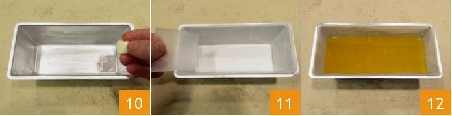 Prepara ahora un molde de plumcake u otro molde al gusto: úntalo con mantequilla 10 y fórralo con papel de horno cortado en tiras para adaptarlo mejor a las paredes 11. Vierte en este punto la mezcla de naranja en el molde hasta alcanzar un grosor de 1,5 cm 12.