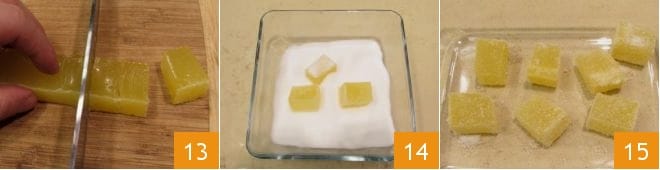 Deja enfriar la gelatina en un lugar fresco y cuando alcance la temperatura ambiente transfiere el molde al frigorífico, durante al menos 4 horas. Transcurrido este tiempo, extrae la gelatina y colócala sobre una tabla de cortar. Según el lado más largo, córtala en tiras a lo largo, luego obtén daditos, rectángulos o cubitos 13.