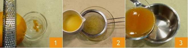 Para preparar los caramelos de gelatina de naranja, ralla la cáscara de una naranja bien lavada y secada 1, luego exprime las naranjas y cuela su zumo 2. Viértelo en un cazo 3.
