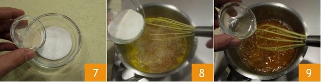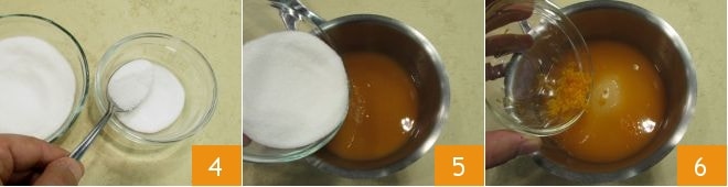 toma de la cantidad de azúcar 2-3 cucharaditas, que reservarás en un bol 4, mientras que el resto puedes añadirlo al zumo de naranja 5. Añade también la cáscara rallada 6 y cocina a fuego bajo. Déjalo hervir durante 5 minutos.