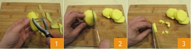 Para preparar los caramelos rellenos con patatas y salchicha con hierbas aromáticas, comienza con las patatas: pela las patatas y córtalas primero en rodajas 2 luego en dados 3.