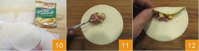 Toma los discos de pasta 10 y rellena cada uno con el relleno de patatas y salchicha (unos 25 g por cada disco; el relleno sobrante puedes reservarlo) 11; luego envuelve el relleno 12 cerrándolo para formar un pequeño cilindro.