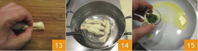 Después pellizca la parte cercana al relleno para obtener la forma del caramelo 14, teniendo cuidado de sellar bien para que no se salga el relleno. Luego escalda los caramelos rellenos en abundante agua hirviendo con sal al gusto 14. Luego derrite la mantequilla en una sartén y cuando esté derretida añade las hierbas aromáticas y sofríe durante 1 minuto 15.