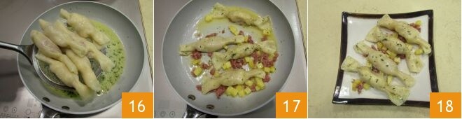 Luego escurre los caramelos y colócalos en la sartén para darles sabor durante unos instantes 16; si aún te queda, puedes añadir también el relleno sobrante 17, para dar más sabor a los caramelos rellenos de patatas y salchicha con hierbas aromáticas 18.