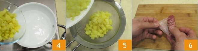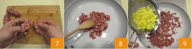 Escalda los dados de patata durante 5 minutos en abundante agua hirviendo con sal al gusto 4, luego cuando estén cocidos podrás escurrirlos cuidadosamente 5. Mientras tanto, haz un corte en una salchicha para eliminar la tripa 6.