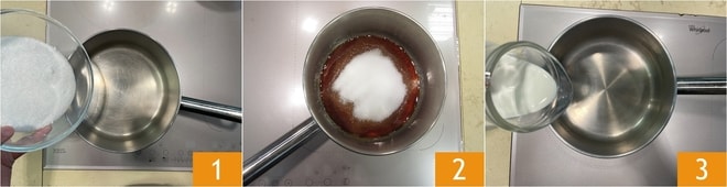 Para preparar el caramelo salado, como primera cosa verted el azúcar en un cazo de fondo grueso, con un diámetro de 20 cm 1. Es importante usar un cazo no demasiado grande, de lo contrario el caramelo podría quemarse en los bordes. Cocinad a fuego medio-bajo, hasta que el azúcar comience a derretirse 2. Ayudaos girando el cazo para uniformarlo y evitar que el azúcar se queme en los bordes. Mientras tanto, calentad la nata 3.