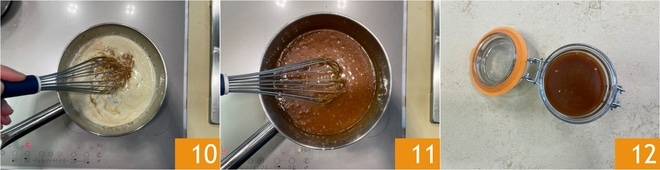 Mezclad con una varilla continuando con cuidado 10. Mezclad hasta obtener una salsa lisa 11, luego transferidla a un tarro esterilizado. Dejad enfriar primero a temperatura ambiente y luego en el frigorífico. Ahora el caramelo salado está listo para usar 12.