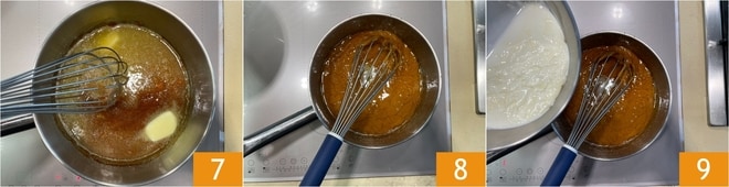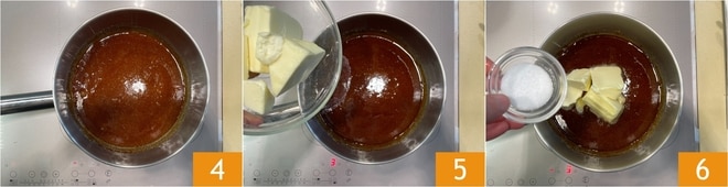Tan pronto como el azúcar esté completamente derretido y vuestro caramelo haya alcanzado un color ámbar 4, bajad el fuego. Añadid inmediatamente la mantequilla 5 y la sal 6.