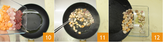 Tan pronto como el fondo esté caliente, añadid los cubos de pescado 10 y salteadlos a fuego alto durante un par de minutos. Luego, eliminad el ajo 11 y reservad los cubos de pescado en un bol 12.