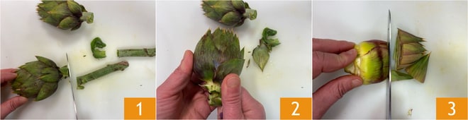 Para preparar las alcachofas rellenas vegetarianas, lo primero que hay que hacer es dedicarse a la Cómo limpiar las alcachofas. Retiren el tallo 1, eliminen las hojas más externas y duras 2 y corten las puntas 3.