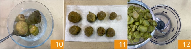 Escurran todo y enfríen en agua con hielo 10, luego coloquen las alcachofas sobre papel absorbente para secarlas 11. Mientras tanto, dedíquense a la preparación del relleno: escurran los tallos y transfiérelos a una batidora 12.