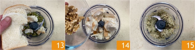 Añadan el pan de molde 13 y las nueces 14, luego trituren hasta obtener una mezcla homogénea 15.