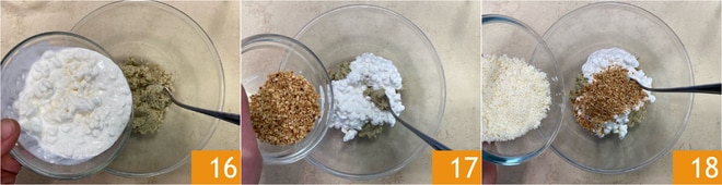 Transfieran la mezcla a un bol y añadan el requesón 16, la granella de avellanas 17 y el queso pecorino rallado 18.