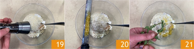 Ajusten de sal y pimienta 19. Luego añadan la ralladura de limón 20 y algunas hojas de mejorana 21. Mezclen para amalgamar los ingredientes.