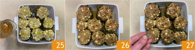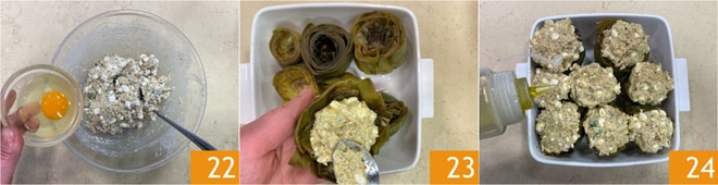 Incorporen el huevo 22 y mezclen una vez más. Rellenen las alcachofas con la mezcla obtenida 23, luego colóquenlas en una bandeja y rocíen la superficie con aceite 24.
