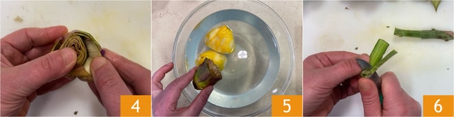 Abran ligeramente las hojas 4 y sumerjan las alcachofas, a medida que las limpian, en agua acidulada 5. Tomen los tallos, eliminen la parte final más dura y pélenlos 6.