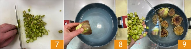 Luego córtenlos en rodajas finas 7. Cuezan las alcachofas 8 y los tallos 9 en agua hirviendo con sal durante 15 minutos.