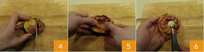 Recorta las alcachofas 4, luego abre ligeramente las hojas, ejerciendo una ligera presión hacia afuera 5, y ve quitando la "barba" con una cucharilla o sacabolas 6 (alternativamente, puedes usar una cucharilla).