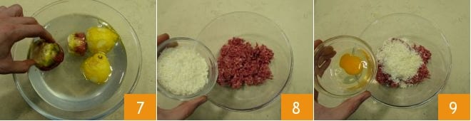 A medida que las prepares, coloca las alcachofas limpias en un bol con agua fría con jugo de limón para evitar que se oscurezcan 7. Continúa con la preparación del relleno a base de carne: pon la carne picada en un bol grande con el queso rallado 8 y el huevo entero 9;