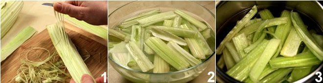 Comenzad la preparación de los cardos guisados limpiando la verdura de esta manera: cortad la parte final del manojo de cardos y separad cada tallo eliminando las hojas. Si los tallos de cardo resultaran demasiado anchos, cortadlos a la mitad a lo largo y luego con un cuchillo, cortad un extremo y tirad del lado opuesto 1 eliminando así los filamentos. Repetid la operación comenzando desde el extremo opuesto. Una vez eliminados todos los filamentos, cortad el cardo en trozos de unos 15 cm que colocaréis dentro de un bol de agua acidulada 2 (es decir, con la adición del zumo de 1 limón), para que no se oscurezcan. Cuando hayáis limpiado y cortado todos los cardos, enjuagadlos bajo agua fría corriente y cocedlos 3 colocándolos en una olla llena de agua junto con una cucharada de sal gruesa durante unos 15 minutos si se trata de una olla a presión o durante unos 25-30 minutos cociéndolos tradicionalmente.