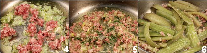 Una vez cocidos, escurrid los cardos. En una cacerola aparte, poned el aceite y los cebollinos que dejaréis ablandar a fuego lento durante unos 15 minutos; agregad la panceta picada 4, el tomillo y la canela 5 y dejad sofreír durante unos minutos, luego añadid los cardos 6, mezclad delicadamente y agregad el vino blanco que dejaréis evaporar.