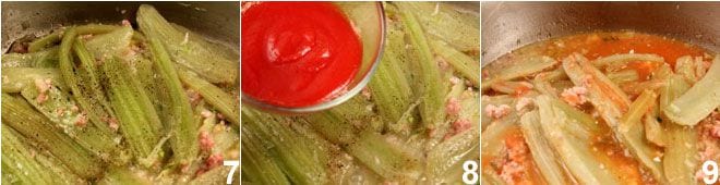 Ajustad de sal y pimienta 7, añadid la salsa de tomate 8 y eventualmente un cucharón de agua caliente, luego dejad cocinar hasta que todos los ingredientes se hayan sazonado 9 y el fondo de cocción se haya reducido. Agregad el parmesano rallado y servid los cardos guisados aún calientes.