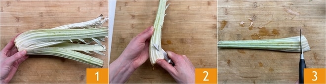 Para preparar los cardos gratinados, comienza limpiando los cardos 1: con un cuchillo pequeño elimina los filamentos externos 2. Recorta la base del tallo 3, luego lávalos bajo agua corriente y sumérgelos en agua con limón para que no se oscurezcan.