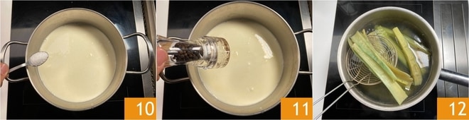 Sazona con sal 10, pimienta 11 y nuez moscada. Reserva y escurre los cardos, que mientras tanto estarán listos 12.