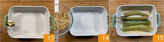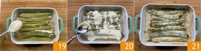 Completa con la bechamel restante 19, el queso rallado y unos trocitos de mantequilla 20. Cocina en el horno durante 35 minutos a 200° en modo estático y luego continúa otros 5 minutos a 250° en modo grill. Retira los cardos gratinados del horno y déjalos templar antes de servirlos 21!
