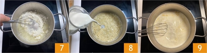 Cocina durante 2 minutos mezclando con un batidor 7. Una vez que hayas obtenido una mezcla dorada y sin grumos, vierte poco a poco la leche caliente 8 y deja que la salsa espese, mezclando siempre con el batidor 9.