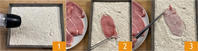 Para realizar la cinta de cerdo en leche, vierte la harina en una fuente, salpimienta 1. Enharina las lonchas de carne por ambos lados, eliminando el exceso 2 3.
