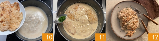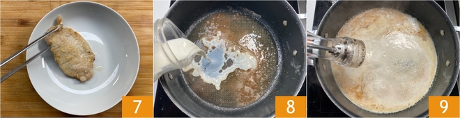 Pasa la carne a un plato y mantenla caliente 7. Vierte la leche en la misma sartén 8, salpimienta 9 y deja que espese durante 4 minutos.