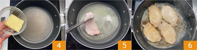 Derrite la mantequilla en una sartén 4, luego coloca la cinta 5 y dórela a fuego medio-alto durante un par de minutos por cada lado 6.