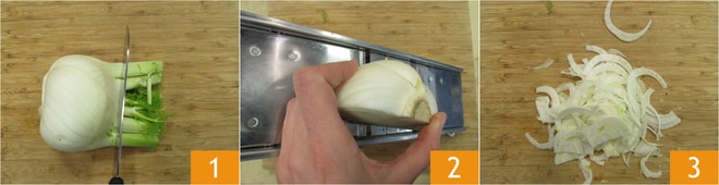 Para preparar el carpaccio de salmón, empezad eliminando los extremos del hinojo 1, ya lavado, y cortándolo por la mitad. Con la mandolina, cortadlo muy finamente 2 3(aproximadamente 2 mm).