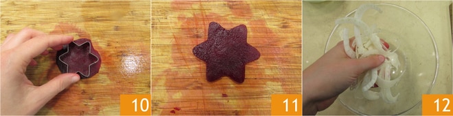 Con un cortador de galletas en forma de estrella 10 recortad cada rodaja 11. En este punto, escurrid los hinojos en otro bol 12.