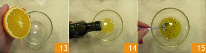 Preparad una vinagreta con el jugo de la otra naranja 13, el aceite 14, sal y pimienta rosa molida 15, mezclad bien para crear la emulsión.