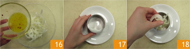 Condimentad los hinojos con la vinagreta 16. Colocad un aro de emplatar de 9 cm en el plato de presentación 17. Comenzad incorporando todo en capas: aproximadamente 30 gr de hinojo 18.