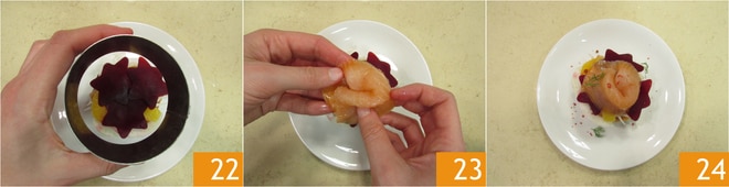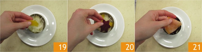 3 gajos de naranja 19, 3 estrellitas de remolacha 20 y una loncha de salmón ahumado 21.