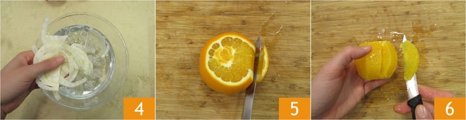 Transferid el hinojo cortado a un bol con agua y hielo para que se rice un poco 4, dejadlo en remojo durante todo el tiempo de la preparación. Quitad la piel de una naranja 5 y peladla al vivo 6.