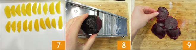 Reservad los gajos en una bandejita 7. También con la mandolina, cortad la remolacha en rodajas 8, no deben ser demasiado finas 9.