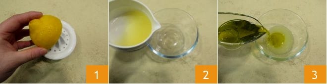 Para preparar el carpaccio de ternera con rúcula y parmesano, comienza con la salsa citronette; exprime los limones 1 y coloca el jugo filtrado en un bol 2: añade el aceite 3,