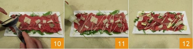 Añade también las lascas de queso 10, luego termina con la salsa citronette 11 y con algunas rodajas de limón. Finalmente, podrás servir y disfrutar de tu carpaccio de ternera con rúcula y parmesano 12.