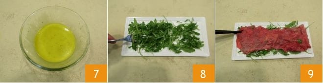 Una vez lista 7, pon la salsa en un dispensador. Coloca la rúcula en un plato de servir, distribuyéndola de manera uniforme 8, corta la carne en lonchas muy finas con la ayuda de una cortadora y distribúyelas sobre la rúcula 9.