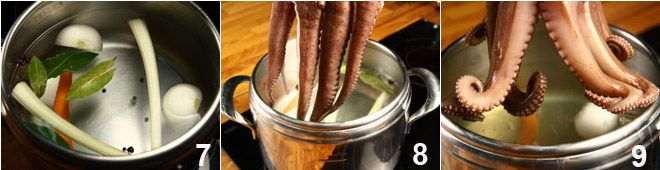Llena con agua ¾ de una olla grande, añade la zanahoria pelada, la cebolla pelada y cortada a la mitad, los tallos de apio, las hojas de laurel, las bayas de enebro, los granos de pimienta y la sal 7. Lleva todo a ebullición, luego sumerge y retira 4-5 veces las puntas de los tentáculos del pulpo en el líquido hirviendo, para que se enrollen (8-9) (resultarán más agradables a la vista):