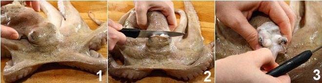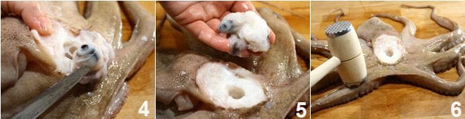 y retira los ojos y el pico (diente) (4-5); vacía también el interior de la bolsa y, si estás tratando con un pulpo de mayor tamaño, ablanda la carne golpeándola ligeramente con un mazo de carne 6.