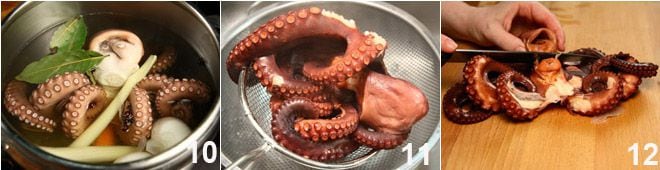 luego sumerge completamente el pulpo en el líquido hirviendo 10 y déjalo cocer durante unos 70 minutos. El pulpo debe quedar cocido pero aún firme, así que verifica su cocción hundiendo un tenedor en la carne. Cuando el pulpo esté cocido, sácalo del líquido de cocción, escúrrelo 11, córtalo en 4-5 piezas (12-13).
