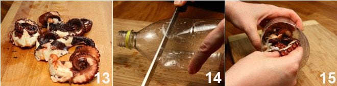 Luego prepara la botella de plástico 14 con la cual darás forma cilíndrica a la carne del pulpo: corta la parte superior e inserta el pulpo de manera armoniosa 15, ya que una vez presionados formarán un diseño en la rodaja que cortes.