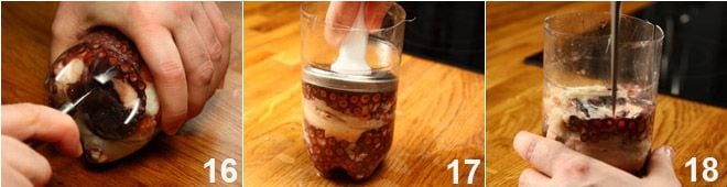 luego perfora el fondo con unas tijeras puntiagudas 16, operación que servirá para que salga el líquido en exceso mientras presionas el pulpo e introdúcelo en la botella que habrás colocado sobre un plato; con la ayuda de una botella de vidrio bien limpia (o cualquier otra cosa que te pueda ayudar a empujar, como un mortero o un mazo de carne) de dimensiones ligeramente más pequeñas que la de plástico, presiona la carne del pulpo empujándola hacia abajo 17; como podrás notar, a través de los agujeros en el fondo de la botella, saldrá bastante líquido de cocción. Con las tijeras corta los extremos de la botella para formar lengüetas 18