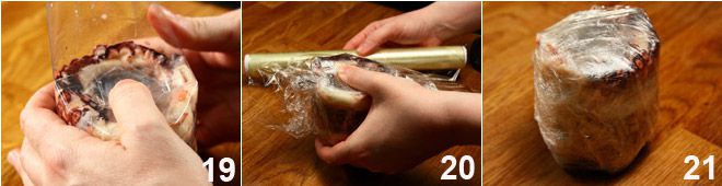 que luego cerrarás sobre sí mismas hacia el centro de la botella 19 luego con film plástico envuelve el pulpo en la botella 20 bien apretado y coloca otro peso encima.