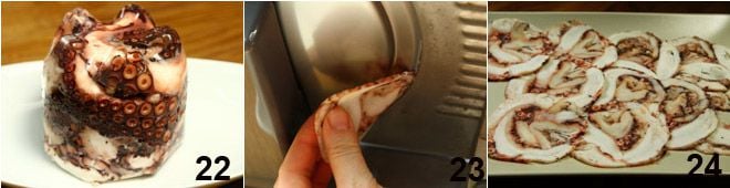 Así prensado, coloca el pulpo en la parte más fría del frigorífico por al menos 24 horas, después, al momento de servirlo, corta la botella de plástico 22, saca el pulpo en un único bloque cilíndrico y córtalo finamente con un cuchillo o, mejor aún, con una cortadora (23-24), como si fuera un salchichón.